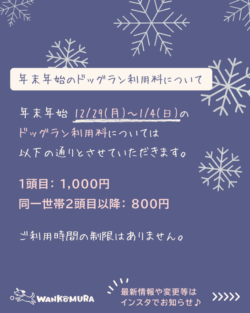 上記期間中、ドッグラン利用料については以下の通りとさせていただきます。