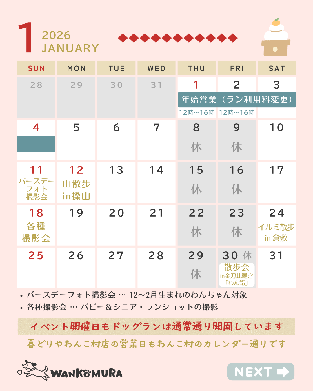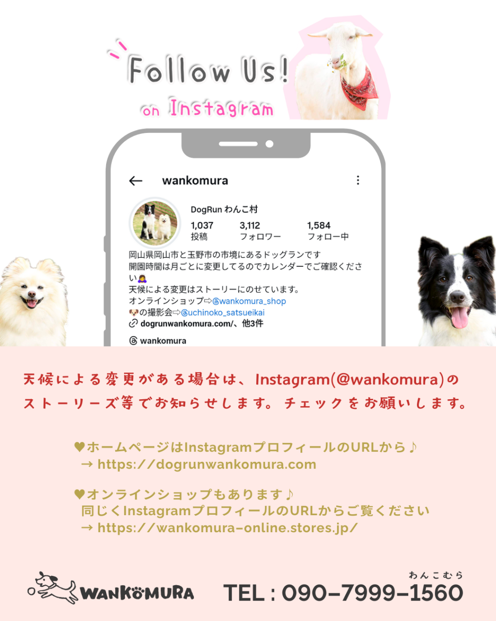 天候による変更がある場合は、わんこ村Intagram @wankomura のストーリーズ等でお知らせしますので、チェック✅をお願い致します🙇♀️
